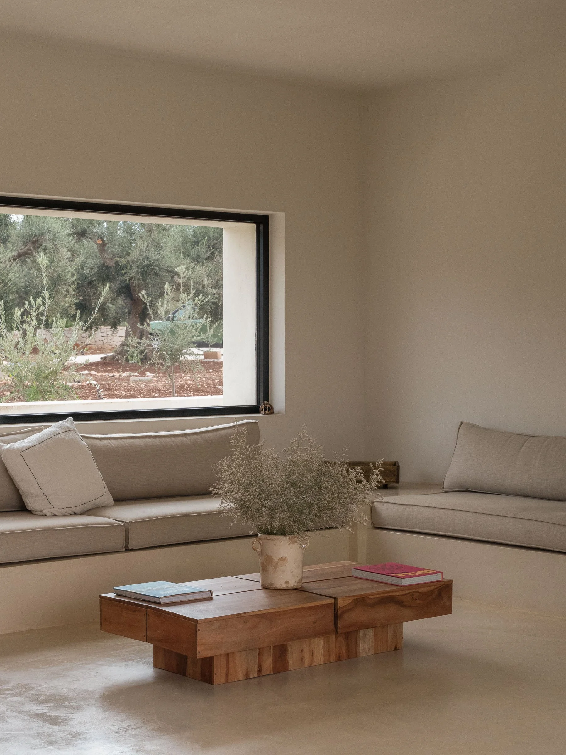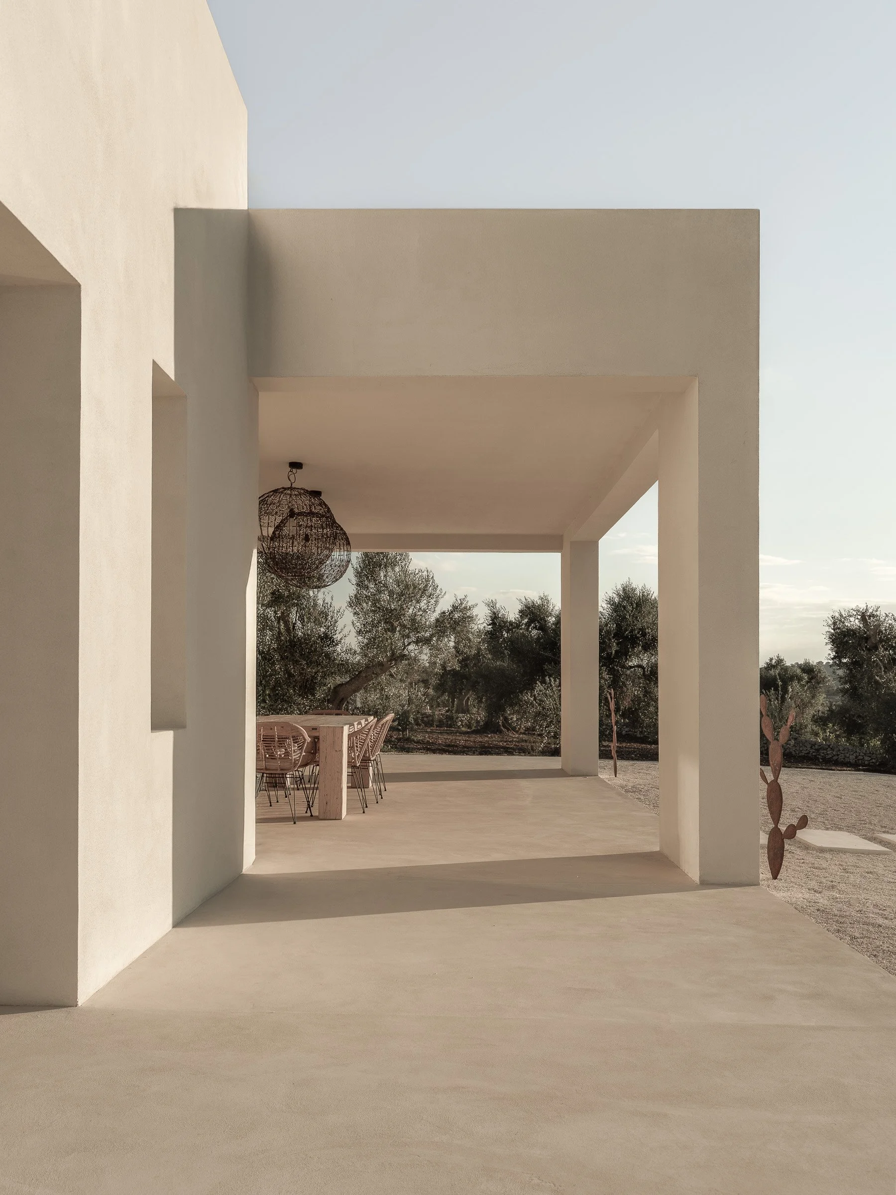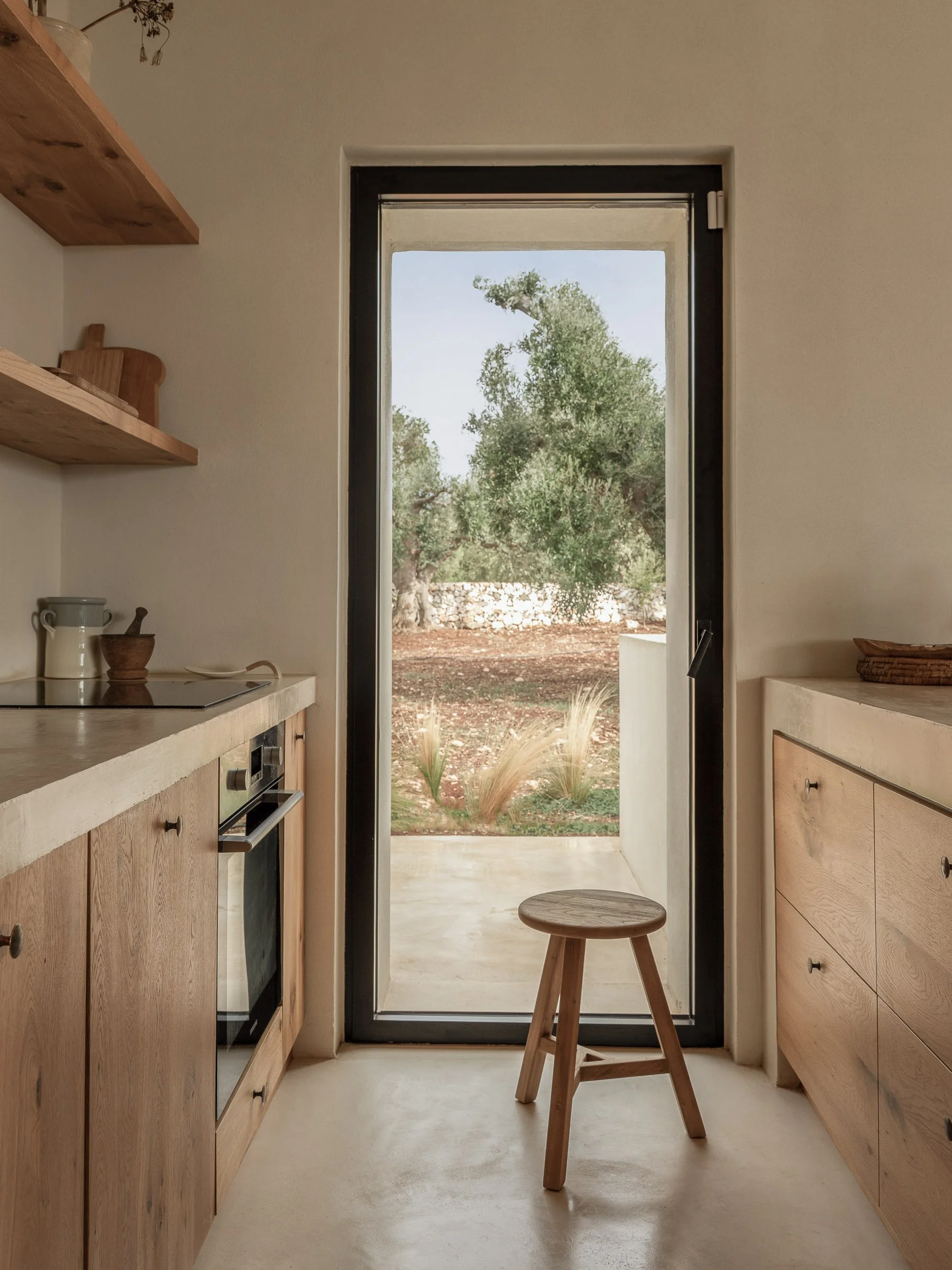 CasaLuce is a refined interpretation of Mediterranean minimalism set among the olive trees and rolling hills of Valle d’Itria. The villa flows naturally between indoors and outdoors, with a bright living area that opens onto a shaded veranda for dining and relaxation. A custom wooden kitchen with a stone island brings warmth and function to the space.