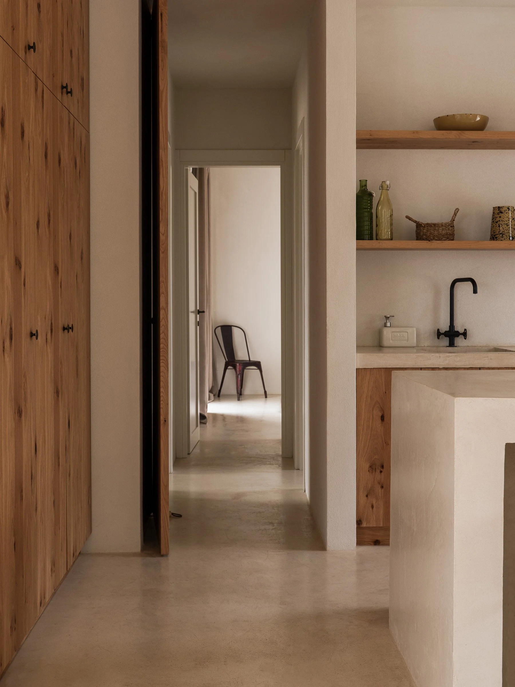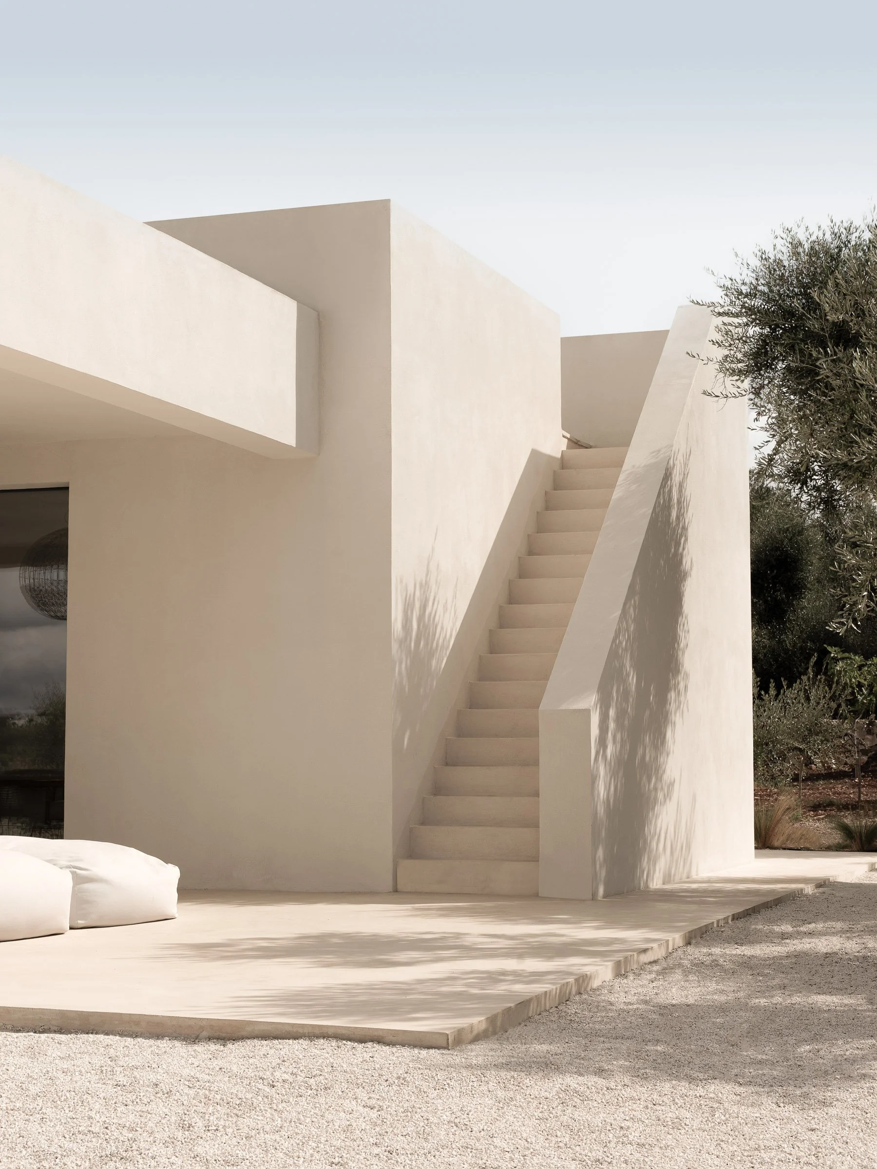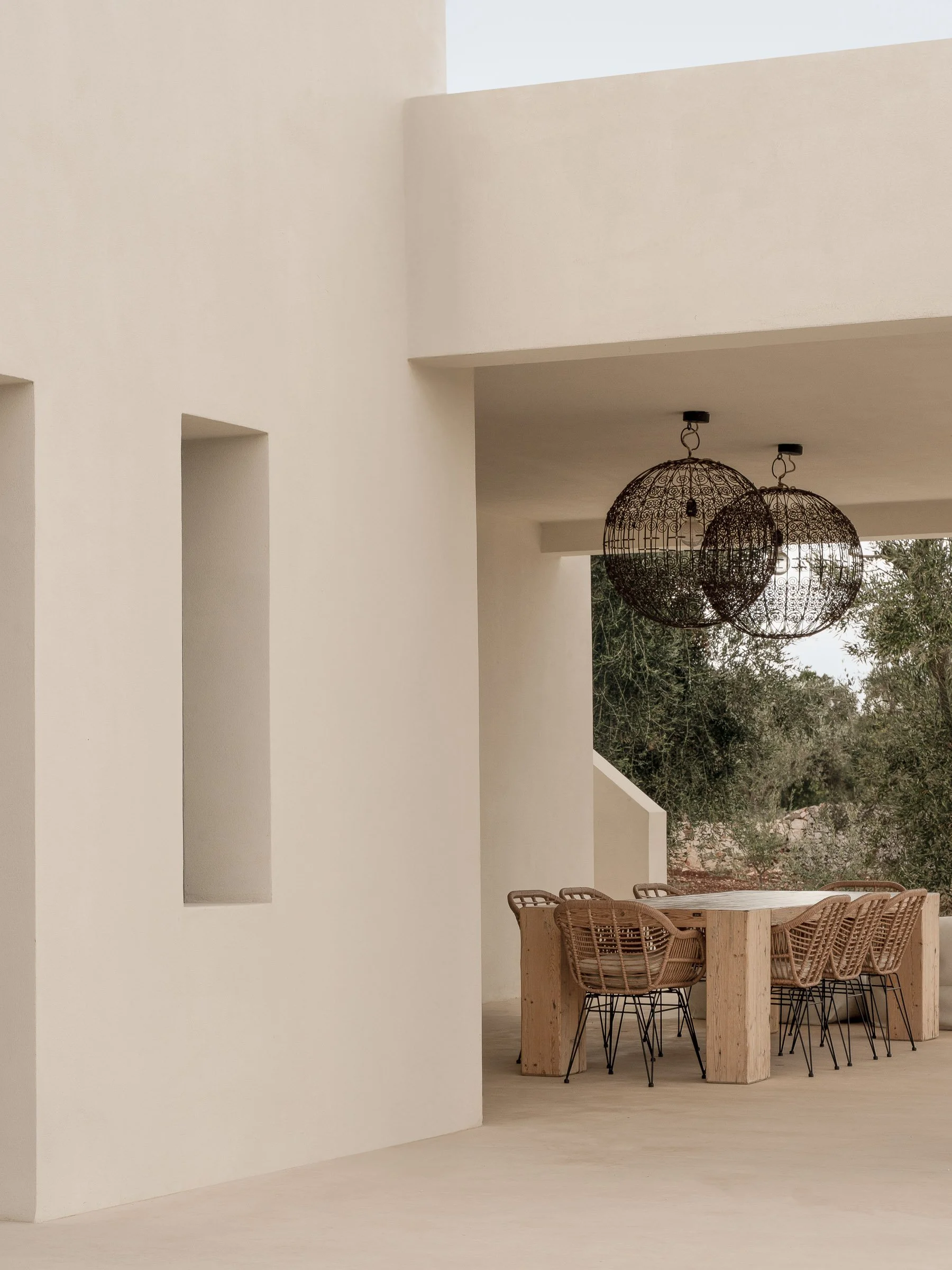 CasaLuce is a refined interpretation of Mediterranean minimalism set among the olive trees and rolling hills of Valle d’Itria. The villa flows naturally between indoors and outdoors, with a bright living area that opens onto a shaded veranda for dining and relaxation. A custom wooden kitchen with a stone island brings warmth and function to the space.